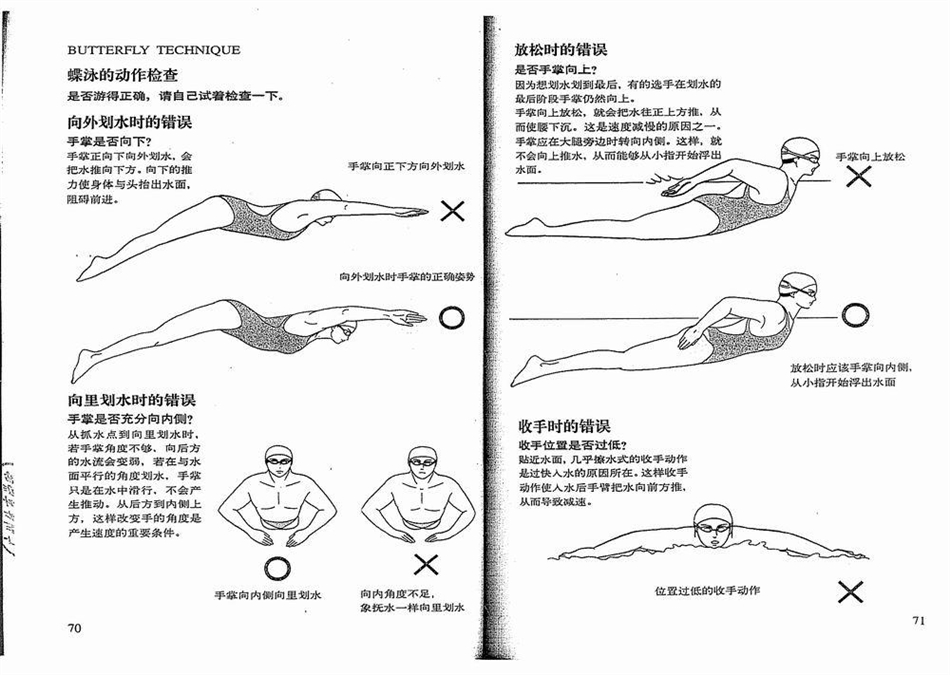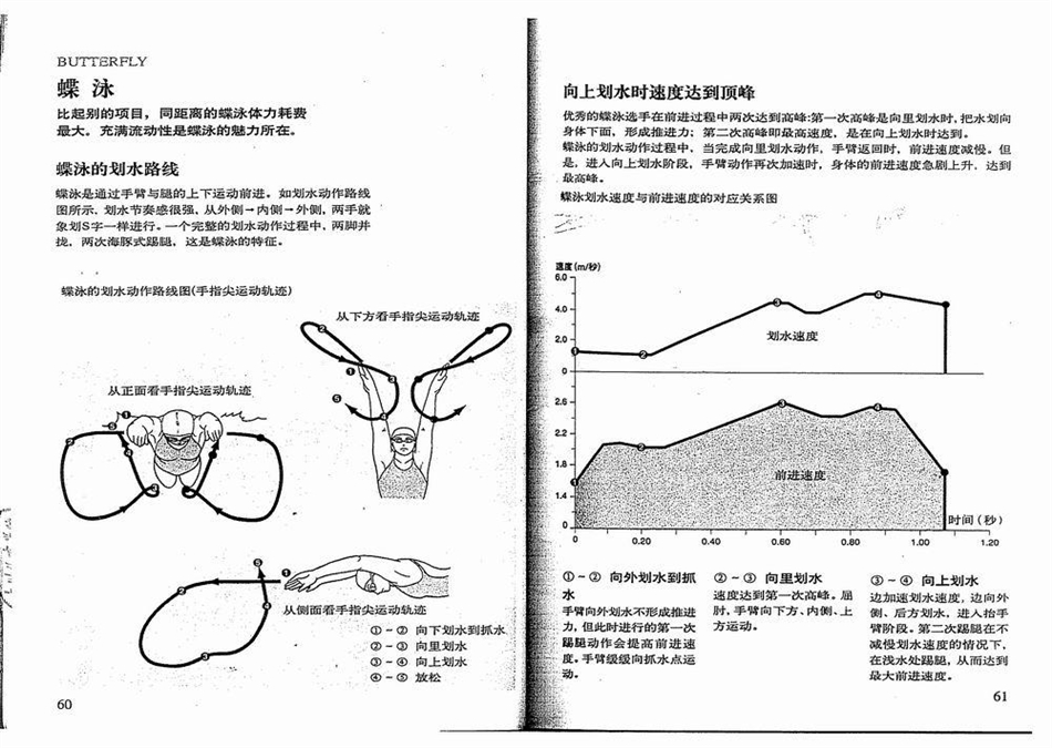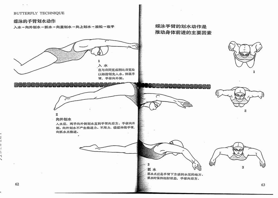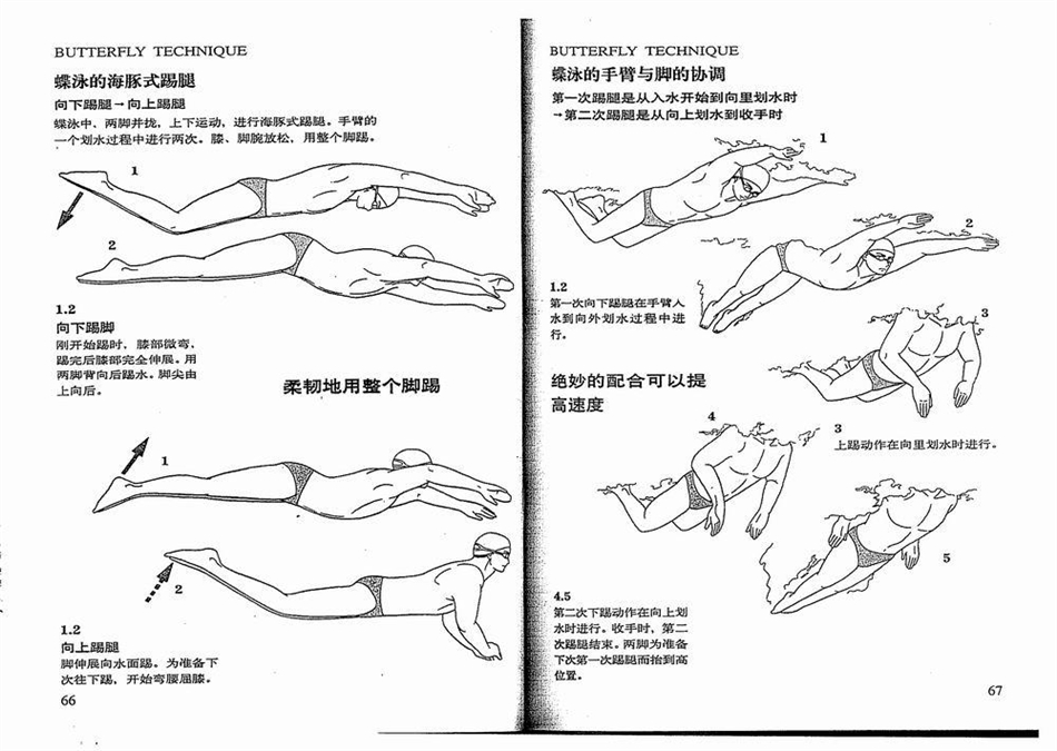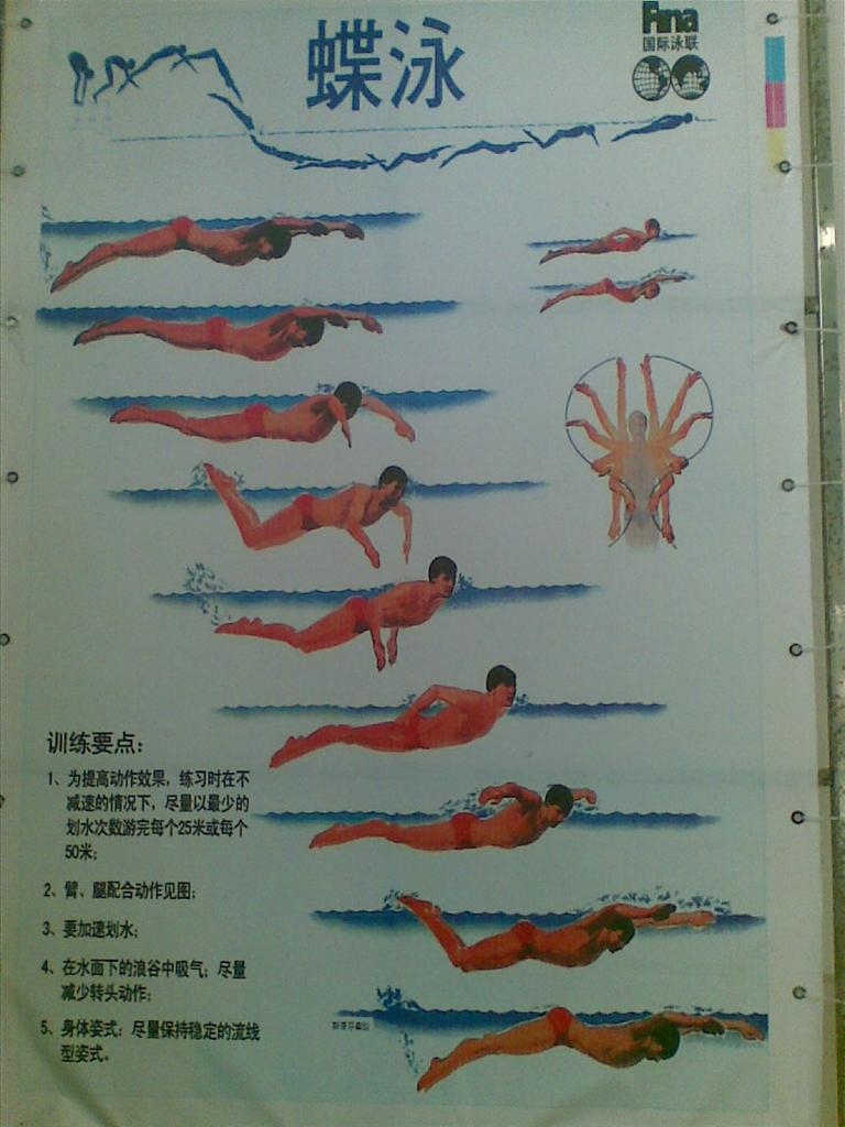 蝶泳技术是仅仅比爬泳技术慢的泳姿。由于它的腿部动作酷似海豚,所以又称为“海豚泳”。蝶泳在四种竞技游泳姿势中是最年青的项目。